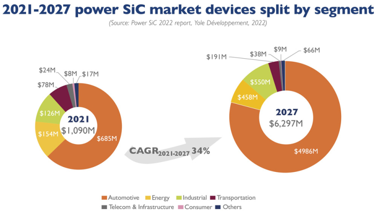 Su adopción está en aumento debido a su capacidad para mejorar la eficiencia energética y reducir el tamaño y peso de los sistemas. Estos semiconductores permitenaumentar la frecuencia de trabajo a 500 - 1.000kHz de modo que se reduce el tamaño y peso de los indicuctores. La estimación del crecimiento del uso de estas tecnologías se muestra en la siguiente figura: