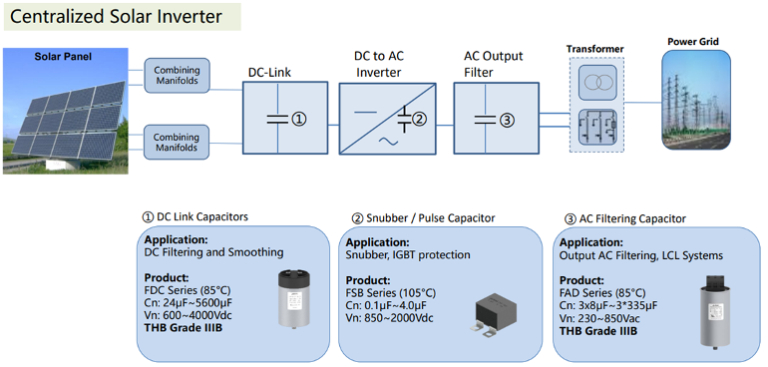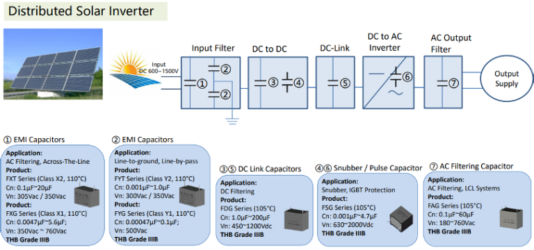 Los condensadores son fundamentales en el proceso de conversión de energía solar y en los diseños de los convertidores y reguladores de energía (especialmente los convertidores DC-AC y los reguladores DC-DC).