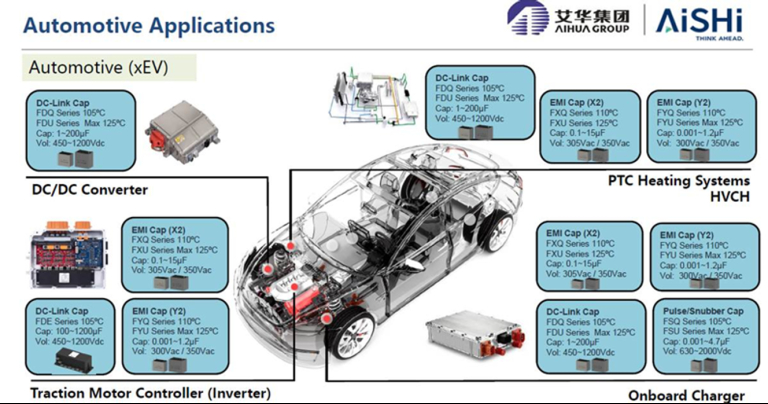 Además de fabricar condesadores de cualquier tipología, cuenta especialmente con condensadores de film para diversas aplicaciones, como DC-Link, AC-Snubber/Pulse, EMI Film, DC Film para PCB, accionamiento de motor AC y condensadores de Media/Alta Potencia. Poniendo el foco en aplicaciones de automotive (Cargadores Vehiculo electrco) y Energías renovables. (Inversoles solares)