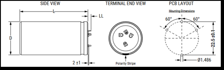 - Montaje a través de orificios (THT): Llos terminales del condensador se insertan a través de orificios perforados en la PCB. y se sujetan mediante soldadura en la parte posterior de la PCB. El montaje THT proporciona mayor resistencia mecánica y es adecuado para componentes grandes o aplicaciones de alta potencia que requieren una mayor disipación de calor. Para este método de montaje se utilizan condensaroes tipo Snap-In, de los que hablaremos más adelante.